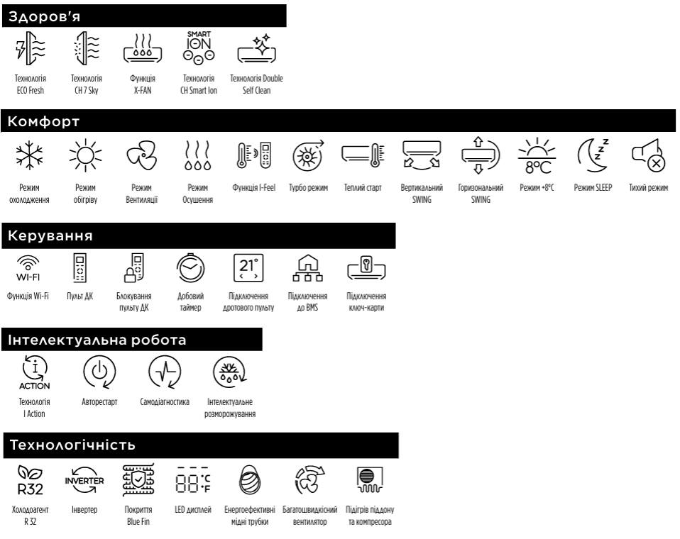 - Self-cleaning IDU — система самоочистки внутреннего блока. Процесс включает замораживание теплообменника с последующим нагревом, что способствует удалению загрязнений и поддержанию чистоты внутри устройства;